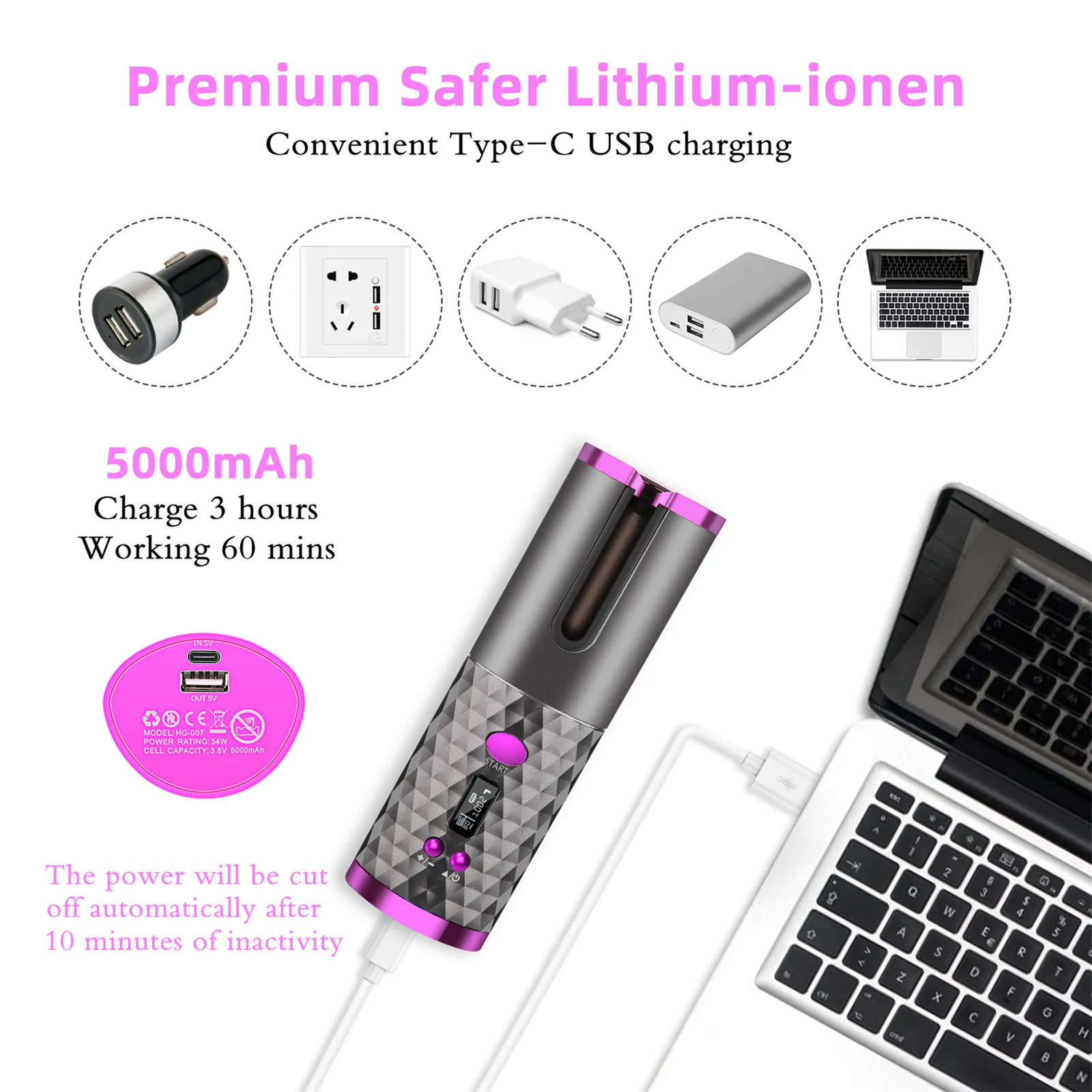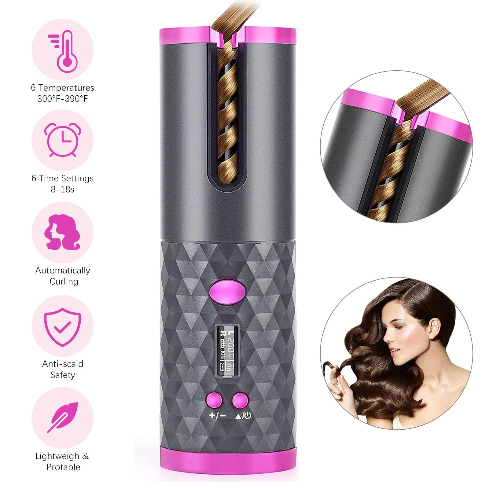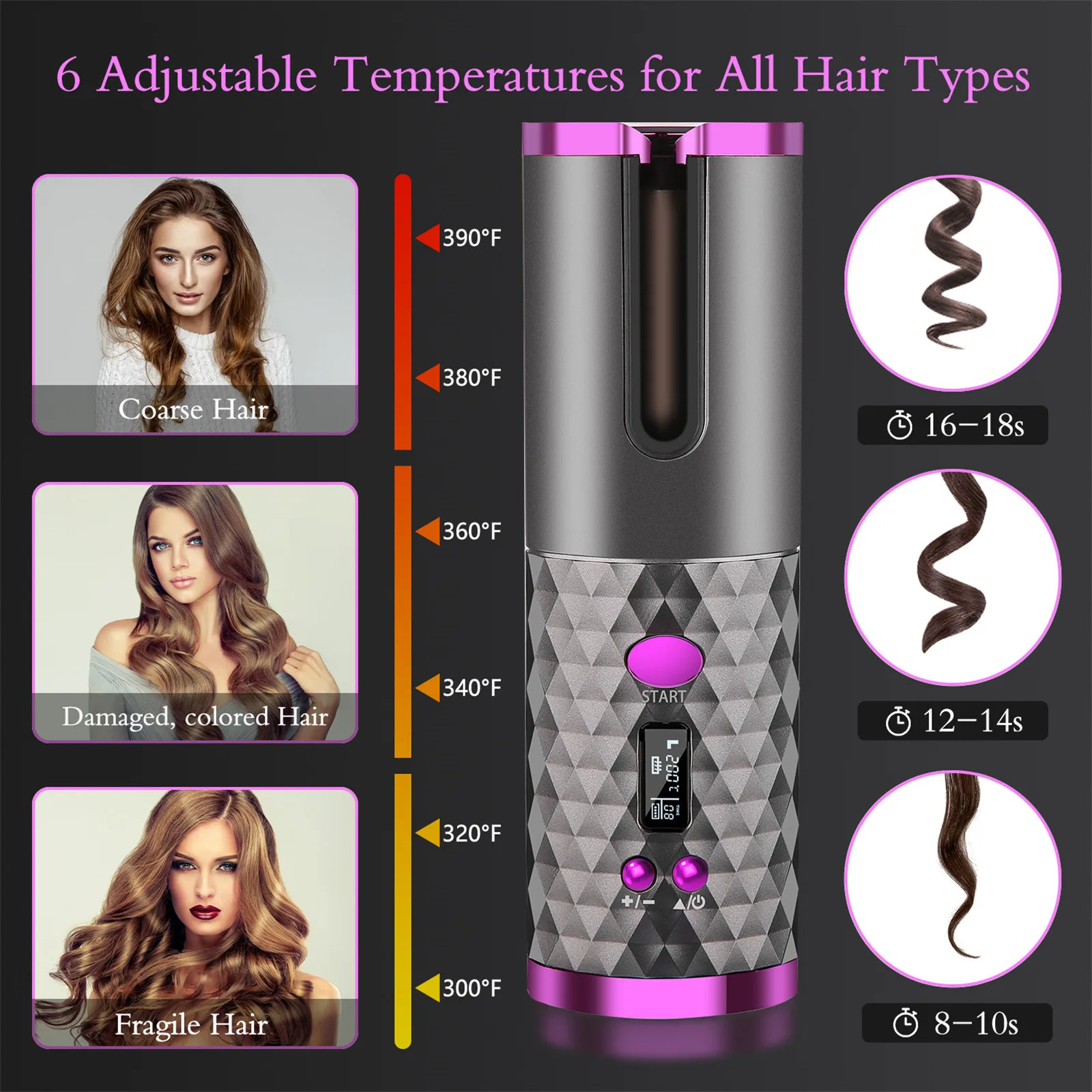 Modelador de Cabelo Automático Sem Fio, com Visor LCD e Temperatura Ajustável, Portátil e Recarregável via USB.